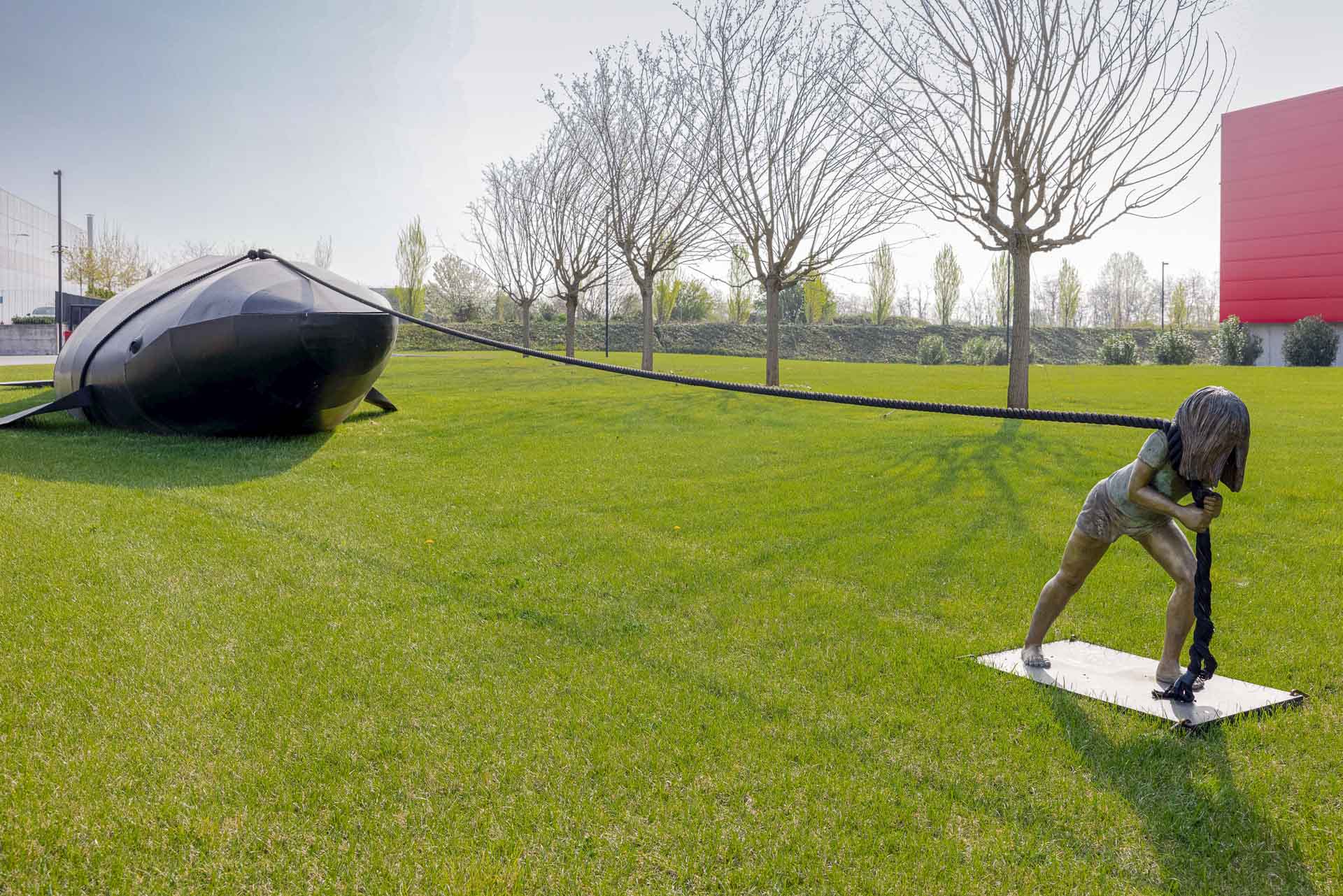 La bimbetta arranca sul prato antistante la palazzina degli uffici: i capelli spioventi sul viso, il corpo gracile teso in avanti nello sforzo di trascinare con una fune una balena spiaggiata. Un’immagine che colpisce. E che commuove: «Per mio padre è stato amore a prima vista, – racconta Beatrice Castellini, Communication & Sustainability Manager di Castellini S.p.A. – la scultura era al centro di una grande rotonda a Faenza e lui ne è rimasto così affascinato da continuare a girarle attorno». Di lì al commissionare all’autore, l’artista bresciano Stefano Bombardieri, una versione destinata alla sede dell’azienda il passo è stato breve: «L’installazione di Faenza era in vetroresina ed era più realistica, la nostra è in metallo calandrato il che le ha conferito una sagoma più geometrica, ma l’impatto emotivo è rimasto immutato: Gaia e la balena – questo il titolo dell’opera – rappresenta la determinazione nel fare qualcosa che viene reputato impossibile, sottolinea l’importanza di non perdere mai di vista il proprio obiettivo ed evoca la certezza che se sei davvero convinto di riuscire in un’impresa, riuscirai a persuadere anche gli altri di questa possibilità, a contagiarli con la tua tenacia, a far loro oltrepassare gli inevitabili momenti di scoramento. Tutto questo siamo noi, ed è quello che ci auguriamo di continuare ad essere».