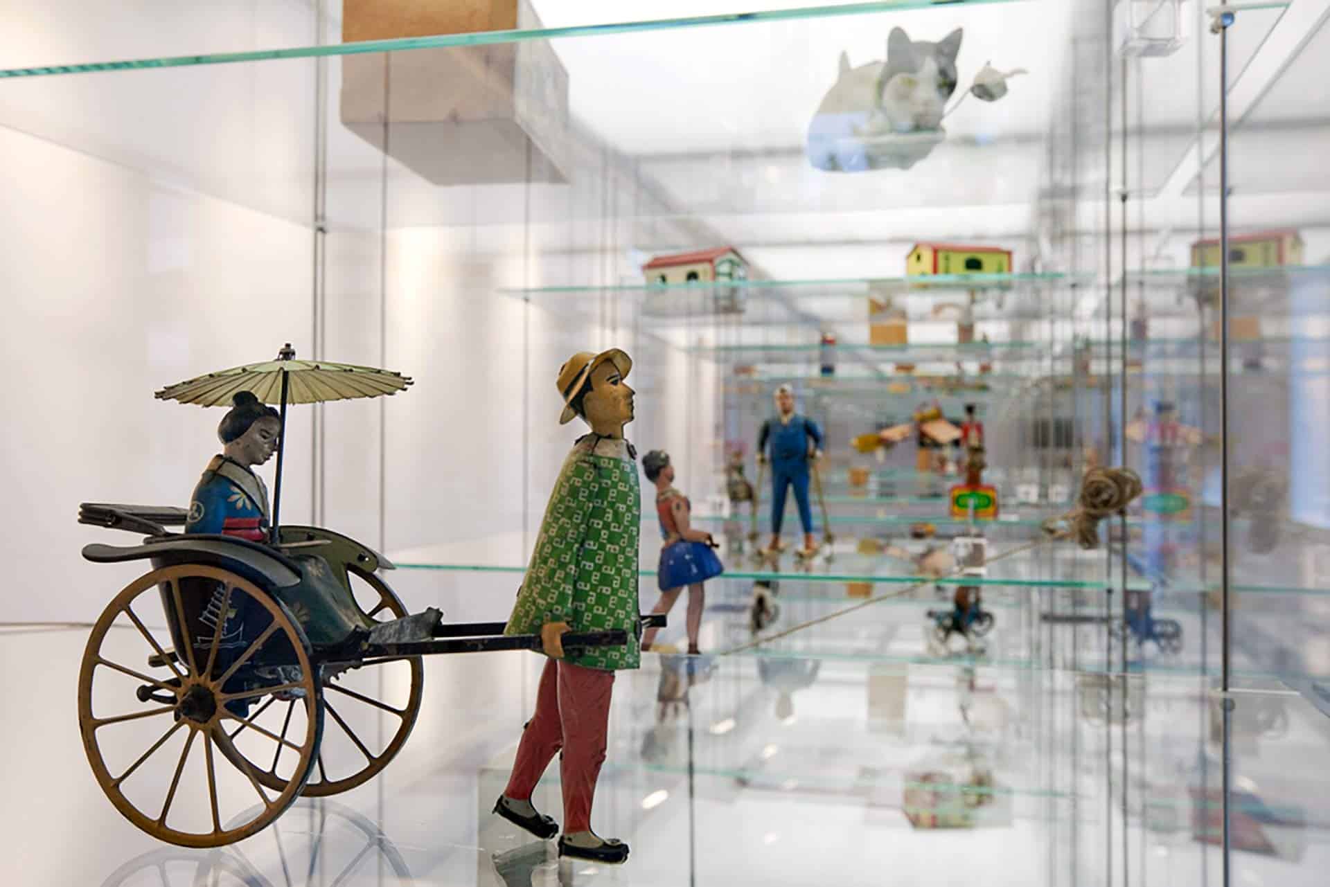 Proprio quando sembrerebbe che la visita sia terminata, una sorpresa: una collezione nella collezione. Nel 2006, infatti, Pietro Catelli decide di fare un altro prezioso regalo al “suo” museo: 41 giocattoli di latta prodotti tra il 1880 e il 1940, dalla storica Lehmann, una delle più famose fabbriche europee di giocattoli (ancor oggi esistente, ma operante negli USA e concentrata esclusivamente sul mondo dei trenini elettrici). I personaggi riproducono il mondo degli adulti con mestieri e scorci di realtà quotidiani spesso interpretati con una vena di umorismo: bellissima è la scenetta con il fornaio sporco di farina e lo spazzacamino coperto di fuliggine che se le danno di santa ragione. Ma dal punto di vista sociologico sono una testimonianza interessante delle manie, delle mode, dei sogni esotici (spesso anche imperialistici) dell’epoca: un inverosimile carretto della posta con conducente nero e traino… a struzzo, Coco bambino indigeno con tanto di turbante in procinto di arrampicarsi su una palma da cocco, un rickshaw (risciò in italiano) dove una geisha compostamente assisa sembra ignorare il mondo che le sfila accanto, ma anche Miss Blondin (versione femminile del celebre funambolo Charles Blondin che attraversò per primo le cascate del Niagara camminando per oltre 300 metri su una corda tesa) in grado di avanzare su un filo sospeso, Skirolf che testimonia l’interesse per lo sci come sport agli inizi del Novecento, il cowboy che con il suo cavallo riproduce esattamente l’esibizione di Buffalo Bill in occasione della tournée in Europa del suo circo. Tutti sono in grado di muoversi grazie a meccanismi a molla, perfettamente funzionanti anche oggi pur confinati come sono, per la loro rarità e delicatezza, in due grandi vetrine, lontani dalle manine “rapaci” dei bambini.
