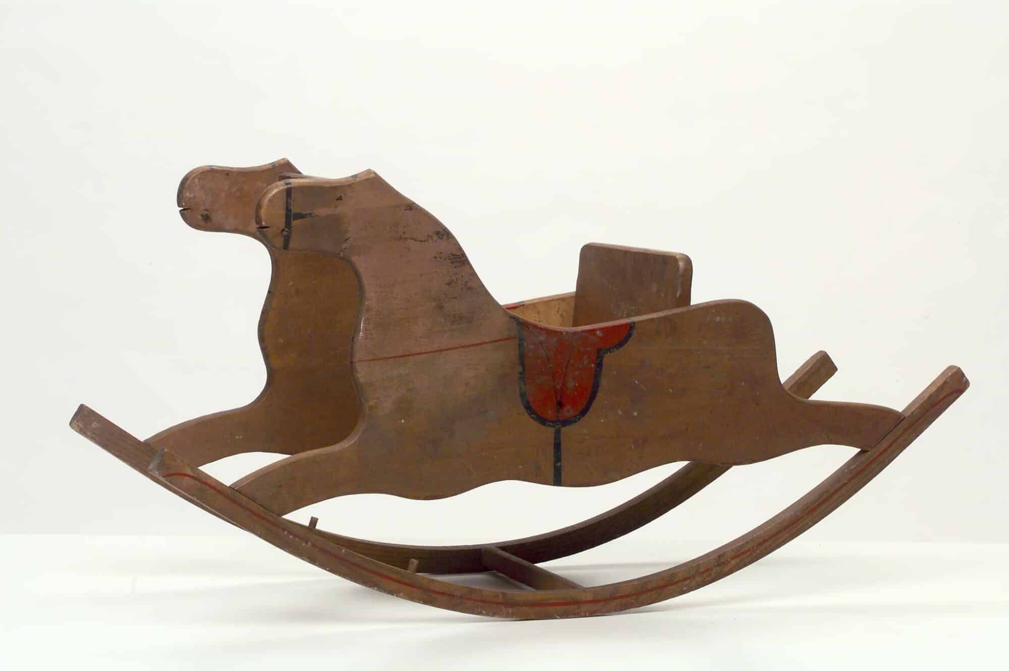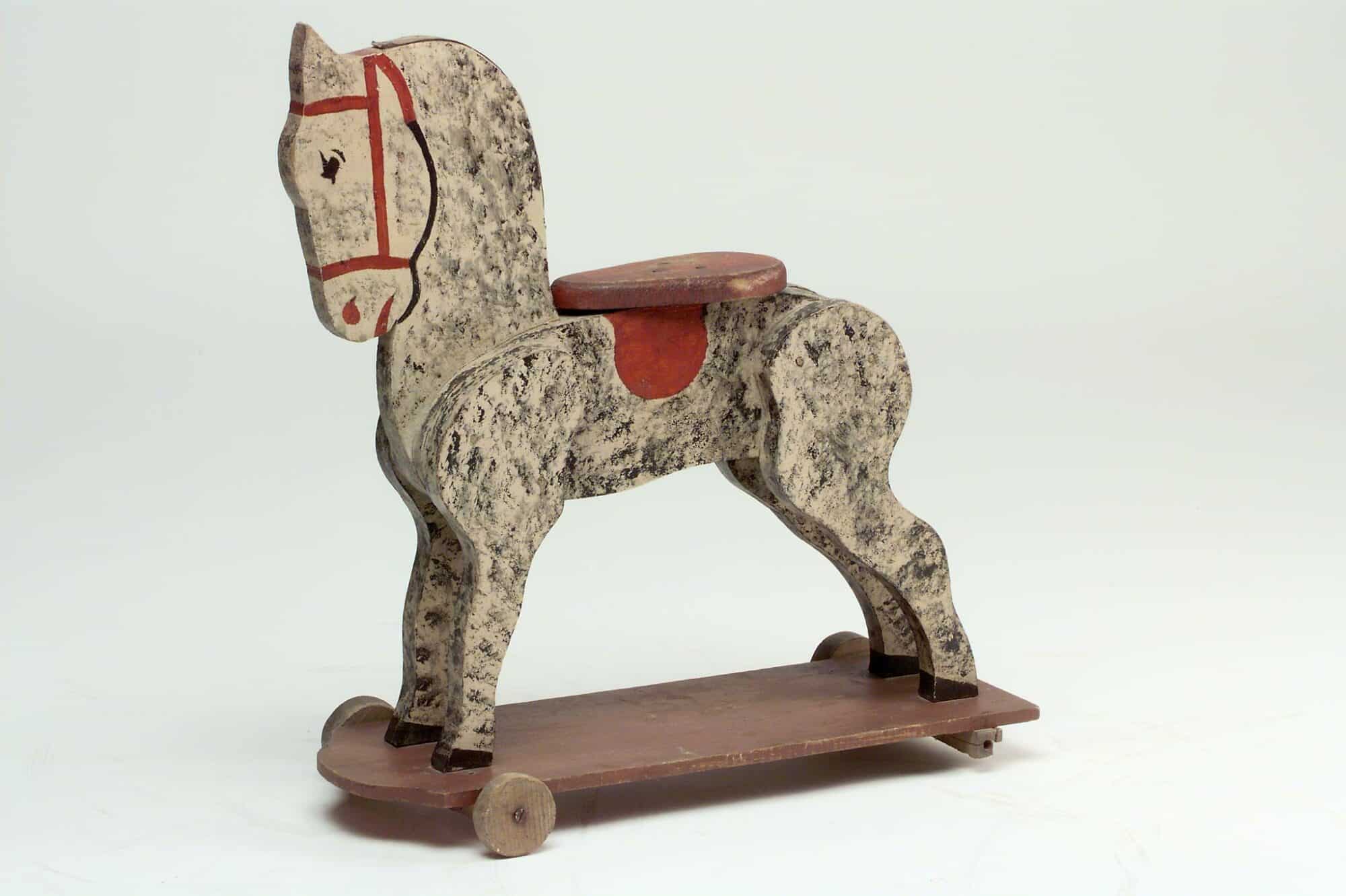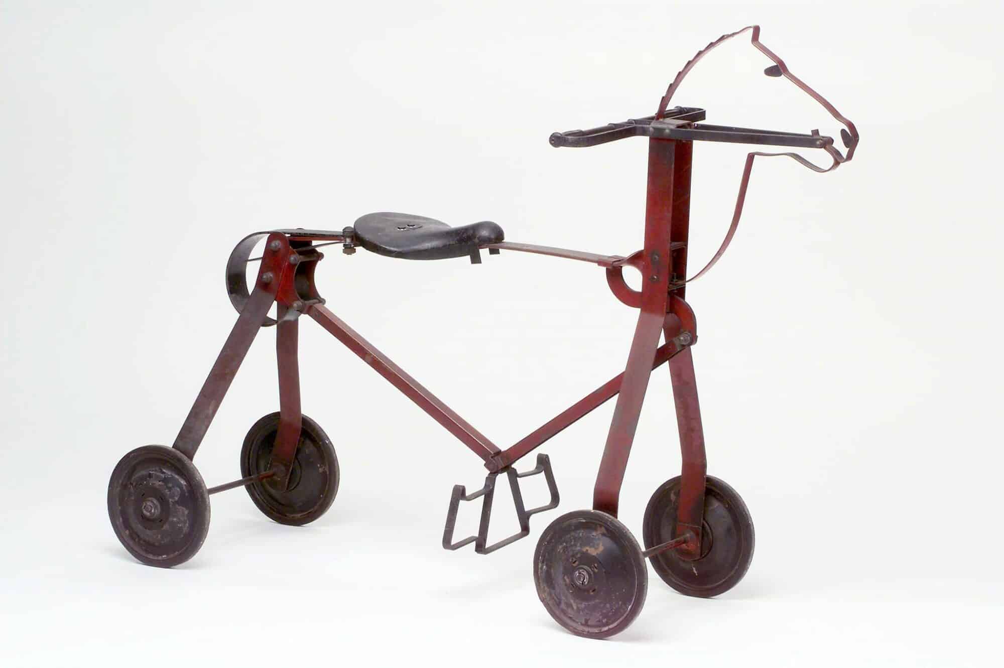Sulla possibilità di movimento si concentrarono molti dei produttori di cavalli giocattolo, in Italia, ma soprattutto in Inghilterra (celeberrima la serie Mobo della ditta D. SEBEL & CO. il cui successo stratosferico le consentì di restare in produzione dagli anni Quaranta fino al 1971) e in Germania, e le loro creazioni costituiscono un’altra tipologia importante: i cavalli a pressione. Senza addentrarsi troppo nel tecnico, possiamo dire che simulavano il trotto di un cavallo grazie a un sistema di molle collegato alla sella su cui il “cavaliere” esercitava una pressione con il suo peso. Nel museo ci sono alcuni bei pezzi, il cui “capostipite” è Rotilio, degli anni Venti, dalla linea slanciata e quasi aerodinamica cui fa da contraltare Max che invece del cavallo ha solo il profilo, in un processo di sottrazione di dettagli che alla fine lo trasforma in un’idea di cavallo straordinariamente contemporanea. Questo esemplare americano degli anni Quaranta presentava un movimento molto originale perché la pressione esercitata dal “cavaliere” sulla sella si trasmetteva alle ruote attraverso balestre da camion, una modalità che ai tempi dovette risultare davvero insolita visto che di questo giocattolo si arrivò perfino a scrivere su una rivista di divulgazione scientifica dell’epoca.