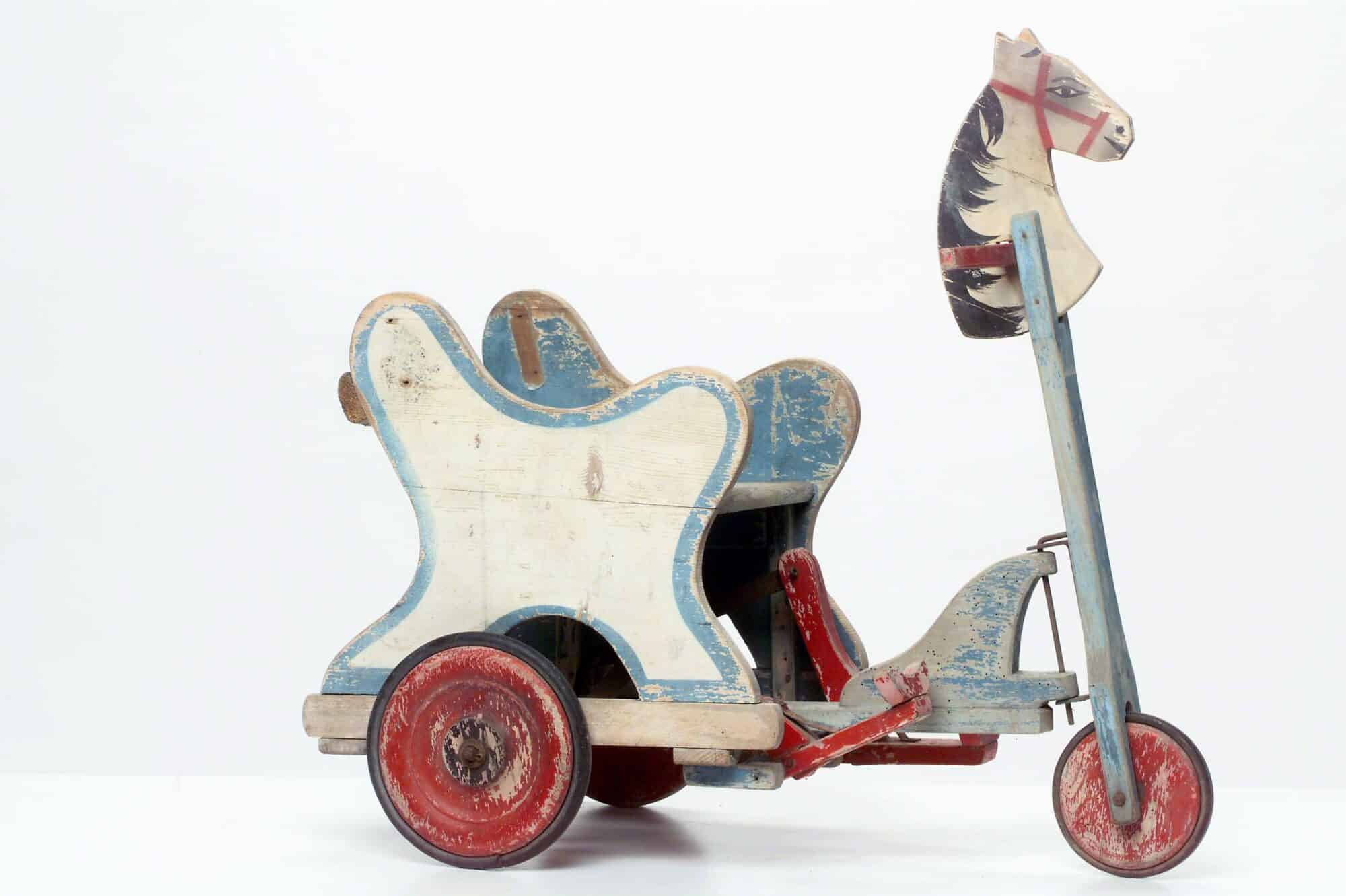 Anche dei cavalli triciclo abbiamo fatto già conoscenza, ma non si può tralasciare di menzionare Medea che era uno dei pezzi preferiti di Catelli: datata tra il 1920 e il 1930, in legno dipinto (il musetto è graziosissimo con occhioni che sembrano bistrati), a metà strada tra un triciclo e una biga, consentiva al bambino di stare bello comodo spostandosi grazie a un sistema ingegnoso a pedali.