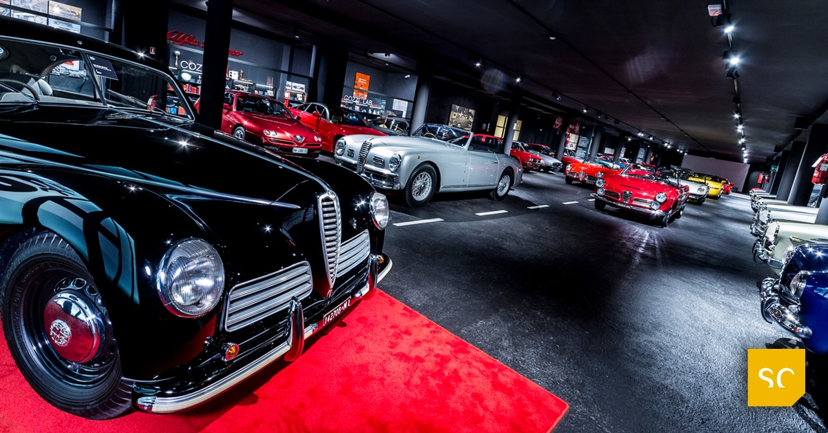 Quel “Mettila lì” non rimarrà un invito isolato, Pietro lo ripeterà più volte fino all’ultimo anno in cui la F.lli Cozzi sarà concessionaria Alfa Romeo, cioè fino al 2015. Quell’anno Pietro compie 80 anni e la sua concessionaria 60, due traguardi anagrafici importanti che meritano una sottolineatura: il regalo che Pietro vuole fare al territorio sarà un museo, aperto al pubblico, che accoglierà la sua collezione. Per costruirlo vengono chiamati Gabriele e Oscar Buratti, due nomi importanti del mondo dell’architettura e del design, che progetteranno un edificio, e un’esposizione, che sono quasi un viaggio iniziatico nel mondo Alfa Romeo. A guidare il visitatore è il colore, a partire dal bianco del guscio esterno, impreziosito – come non ricordare il motto less is more di Mies van der Rohe – dalla sua essenzialità, per continuare nel rosso accecante dell’area di accoglienza per poi arrivare al nero del sancta sanctorum: si scende una scala, l’ingresso è in un buio silenzioso che disorienta il visitatore, e poi improvvisamente fiat lux, si accendono mille luci, che si riflettono, moltiplicandosi, nelle cromature e negli specchietti delle auto in una scenografia sontuosa resa ancora più emozionante dalla musica a tutto volume che sembra squarciare lo spazio. Siamo davvero nel cuore vivo della collezione, quando la musica si abbassa ti sembra di sentirne i battiti. Anche la disposizione delle auto è stata pensata nei minimi dettagli, vuole riprodurre una strada: asfalto sul pavimento a simulare una strada con tanto di strisce bianche tratteggiate di mezzeria. Qui, su due corsie, «sfilano» anche se sono immobili (ma l’illusione è perfetta) le spider, mentre lateralmente, in due navate separate dalla «strada» centrale da due teorie di pilastri, sono «parcheggiate» le berline da una parte e le coupé dall’altra. Il colpo d’occhio è mozzafiato, siamo in una cattedrale laica dove si sta celebrando un brand che esiste ancora, purtroppo non più smagliante come un tempo.