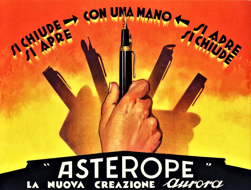 Asterope segna un momento particolare nella storia di Aurora, quello della quiete appena prima della tempesta delle leggi razziali fasciste. Siamo nel 1934 e Isaia Levi (ricordate? Era il proprietario di Aurora) pensa di poter tirare un sospiro di sollievo: avendo fin dall’inizio appoggiato Mussolini nella sua ascesa, è appena stato nominato senatore, segno certo del favore del regime; dal punto di vista economico, dopo la grande depressione del ’29 che ha investito anche l’Italia, le cose vanno decisamente bene e ogni modello lanciato sul mercato viene accolto con favore. È in questo clima di ottimismo che nascono alcune delle penne più interessanti di Aurora e certamente Asterope è la più originale. Innanzitutto è senza cappuccio: un pulitissimo cilindro di celluloide dal quale il pennino protrude semplicemente facendo scorrere un pulsante posto sul corpo della penna. Così la stilografica può essere aperta e chiusa con una mano, strumento ideale dell’uomo d’affari moderno, dall’agire veloce, che non può e non vuole permettersi di indugiare nemmeno un secondo per svitare un cappuccio, lo stesso però che con aria meditabonda campeggia su una pubblicità dell’epoca: «la riflessione costituisce la base di ogni acquisto intelligente», velocità sì, ma non precipitazione! Asterope venne prodotta in pochi pezzi forse anche perché, se l’utilizzo era molto semplice e immediato, non così il caricamento, molto più laborioso rispetto agli altri modelli.