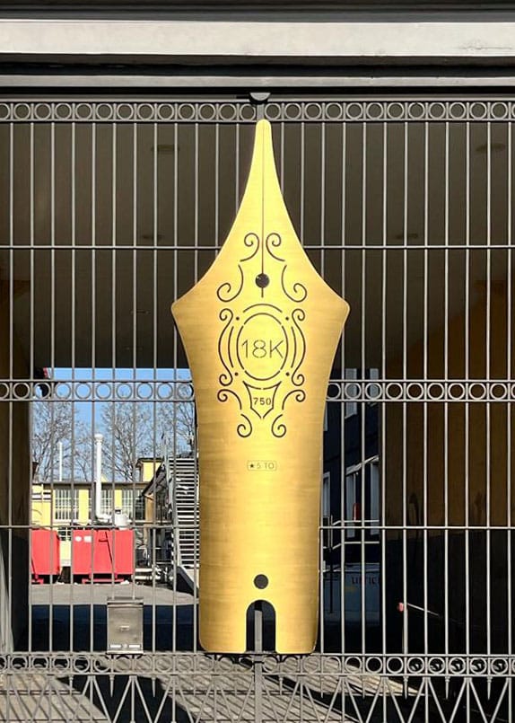 Che la scrittura qui domini incontrastata lo si capisce subito, a partire dal gigantesco pennino dorato che dai cancelli di ingresso si impone allo sguardo di chi arriva: con un po’ di immaginazione lo si potrebbe veder tracciare gli elegantissimi svolazzi calligrafici che si ritrovano ovunque, come una cifra distintiva del luogo, andando perfino a sostituire i cartelli di indicazione per i visitatori.