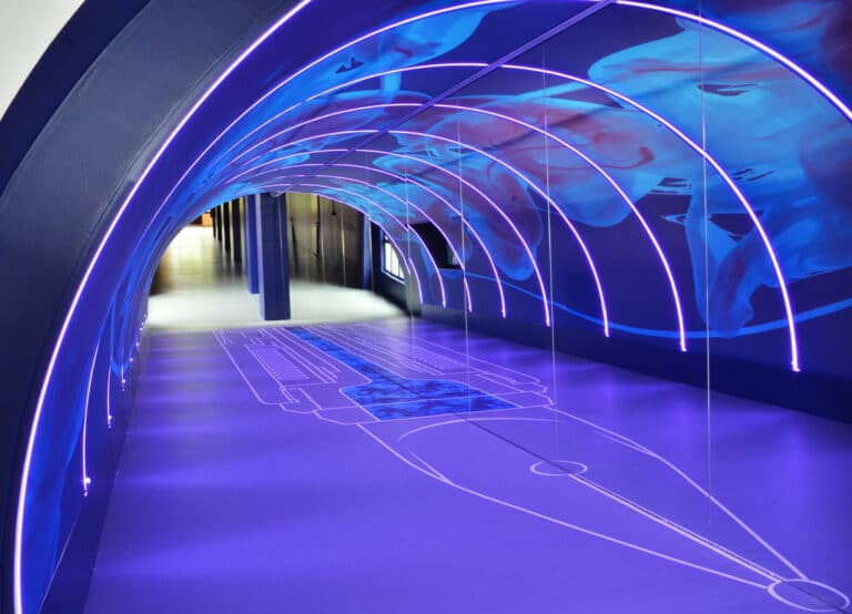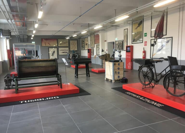 È ora di tornare al museo e di passare all’area degli ex uffici, allestiti come un continuum temporale di “vita aziendale” dagli anni Venti agli anni Settanta con tante postazioni di lavoro dai pezzi e strumenti originali, e da lì al corridoio dell’inchiostro dove in un ambiente immersivo ed emozionale che riproduce l’interno di una penna si vive l’esperienza “sei una goccia d’inchiostro”: il visitatore passando attraverso il tunnel ripercorre il tragitto appunto dell’inchiostro dal serbatoio al pennino. Chiude il percorso la Sala dei mestieri, omaggio alla cultura del fare manuale che impronta l’azienda, e qui si trova, tra vecchie attrezzature dismesse, un pezzo straordinario degli anni Cinquanta che sembra uscito da un film neorealista, la bicicletta del riparatore di penne: superaccessoriata, con tutti gli attrezzi necessari per effettuare le riparazioni delle penne “sulla strada” e la cassettina degli inchiostri, non manca neppure l’ombrello, alla bisogna parasole o parapioggia, e la “schiscetta” per il pranzo.