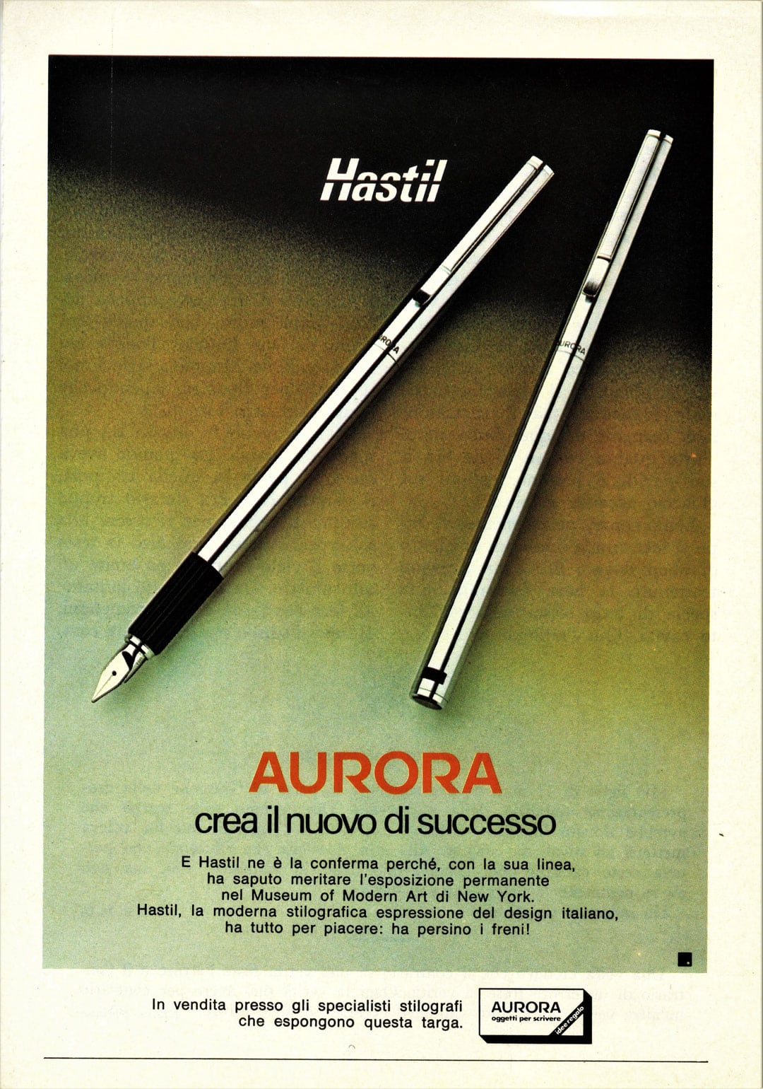 Completamente diversa è la situazione negli anni Settanta quando viene concepita Hastil. Tanta acqua è passata sotto i ponti della storia: al termine della guerra, Isaia Levi, tradito dal regime che pensava di aver ammansito e costretto a rifugiarsi in Vaticano per evitare la deportazione, si è rimesso al timone di Aurora. Ormai però è un uomo provato, desidera darsi un successore e lo trova in un nipote, Giovanni Enriques, poco prima di morire. Lato Verona e la rappresentanza della Remington in Italia, tutto quello che Cesare era riuscito a costruire in quarant’anni di lavoro, è andato in frantumi: con le norme autarchiche che vietano di importare prodotti dall’estero, l’azienda si è sfaldata e, dopo uno sfortunato tentativo di rialzare la testa nel Dopoguerra, chiude negli anni Cinquanta; chi resta della famiglia, Giorgio e Luciano (due dei tre figli di Cesare), è da tempo emigrato in Argentina alla ricerca di contesti economici più favorevoli. Ma nel 1958 avviene un evento che cambierà le sorti di tutti i protagonisti di questa saga: Franco Verona (figlio di Giorgio e padre dell’attuale Cesare), tornato temporaneamente in Italia, incontra Giovanni Enriques e questi, intuite le potenzialità del giovanotto, gli offre di lavorare in Aurora. Sarà l’inizio di un sodalizio che in tre anni porterà Franco Verona non solo ad acquisire il controllo dell’azienda, ma anche a rilanciarla, una sfida vinta per capacità e anche un pizzico di fortuna: vengono risanati i conti, si torna in utile, e poi Aurora si getta nella creazione di nuovi modelli che entreranno nella storia degli strumenti di scrittura. Arriviamo così alla fine degli anni Sessanta. È un momento di grande fermento in tutti i campi, “cambiamento” è la parola d’ordine e anche in Aurora si sente questa esigenza, occorre una penna che sia rivoluzionaria, non ultimo per risollevare le vendite che stanno rallentando. Franco Verona ha già in mente un designer, Marco Zanuso: dalla sua creatività nascerà la Hastil, oggi esposta al MOMA di New York come esempio di design italiano. È un modello minimalista, ma molto complicato che ha posto diverse sfide costruttive, prima fra tutte il rapporto tra un serbatoio e un cappuccio che si volevano dello stesso diametro e il pennino centrato rispetto al corpo della penna. Il risultato è un elegantissimo cilindro in acciaio, leggero e maneggevole, un vero e proprio gioiello rimasto in produzione per decenni.